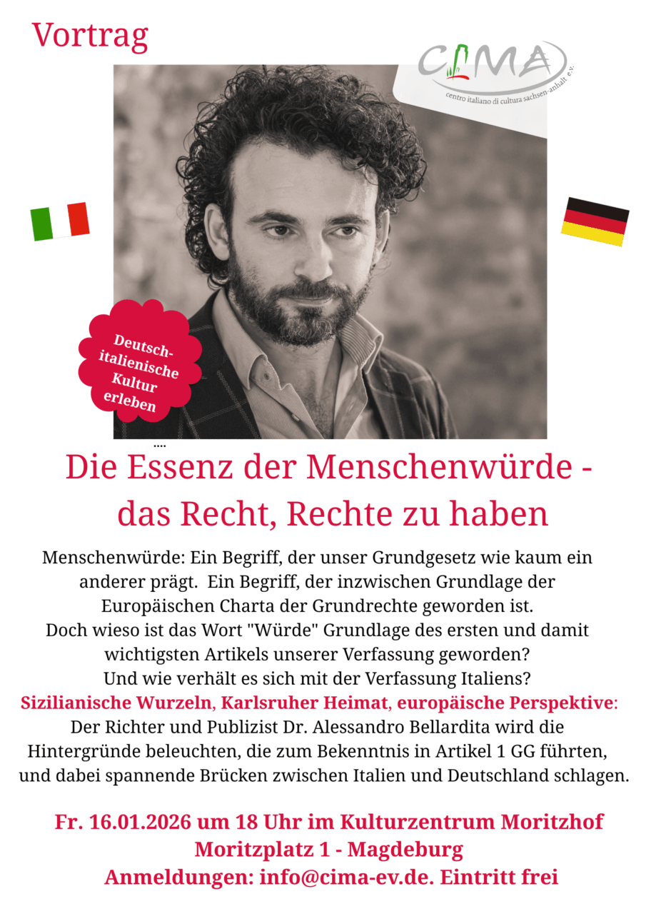 Menschenwürde: Ein Begriff, der unser Grundgesetz wie kaum ein anderer prägt. Ein Begriff, der inzwischen Grundlage der Europäischen Charta der Grundrechte geworden ist. Doch wieso ist das Wort „Würde“ Grundlage des ersten und damit wichtigsten Artikels unserer Verfassung geworden? Und wie verhält es sich mit der Verfassung Italiens? Der Richter und Publizist Dr. Alessandro Bellardita (sizilianische Wurzeln, Karlsruher Heimat, europäische Perspektive) wird die Hintergründe beleuchten, die zum Bekenntnis in Artikel 1 GG führten, und dabei spannende Brücken zwischen Italien und Deutschland schlagen.